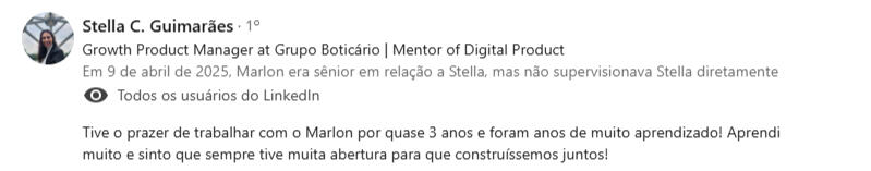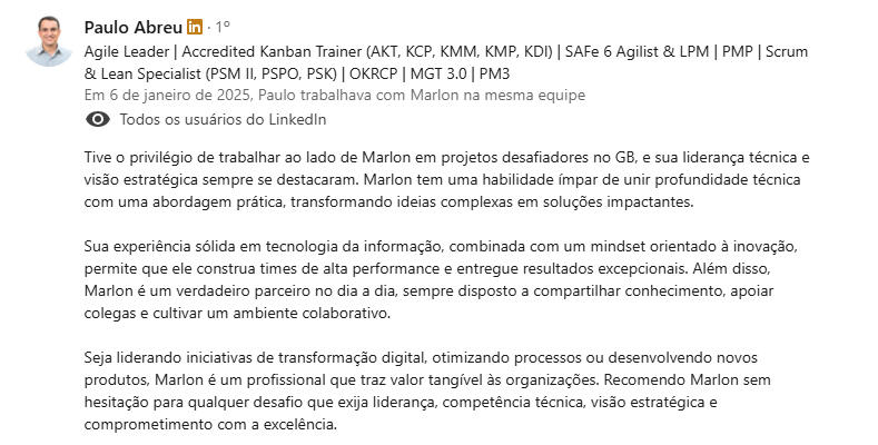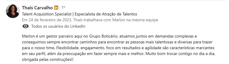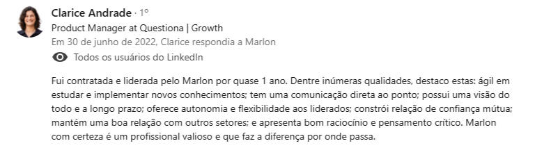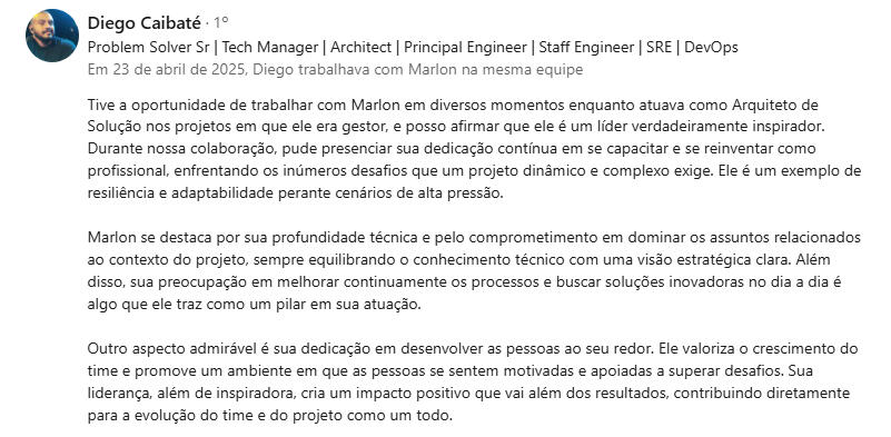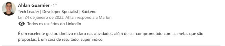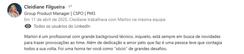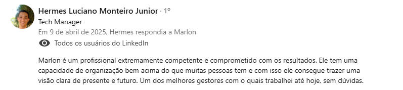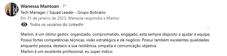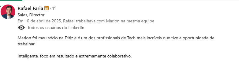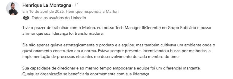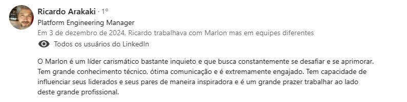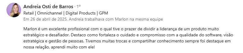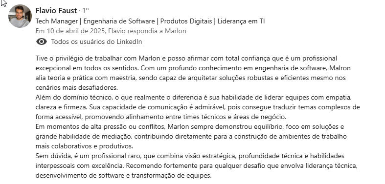 Já passei por startups, pequenas, médias e grandes empresas de tecnologia, nacionais e internacionais, tanto como liderança técnica quanto como liderança de gestão.